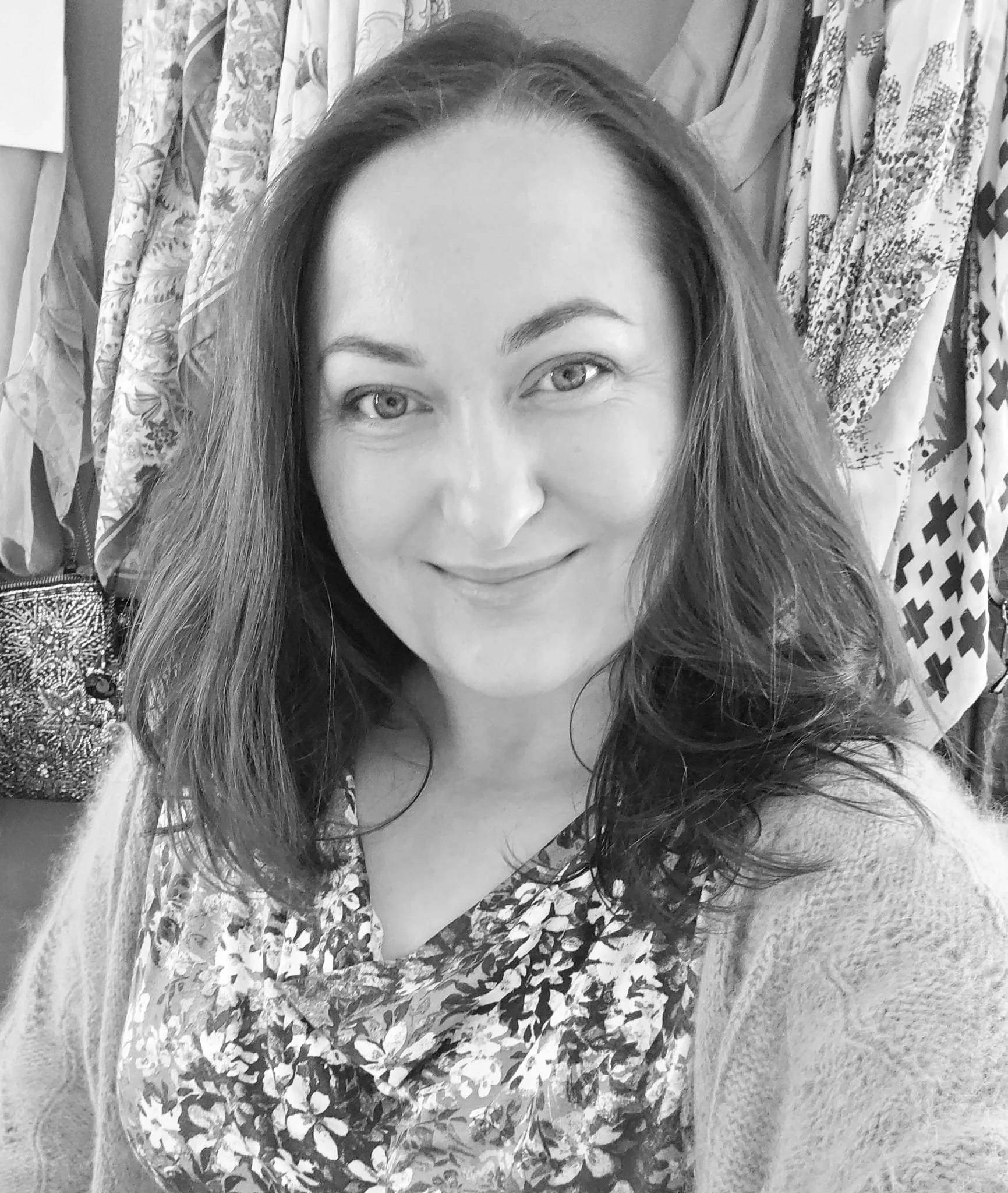 A woman with shoulder-length hair smiling at the camera with a background of patterned fabric hanging.