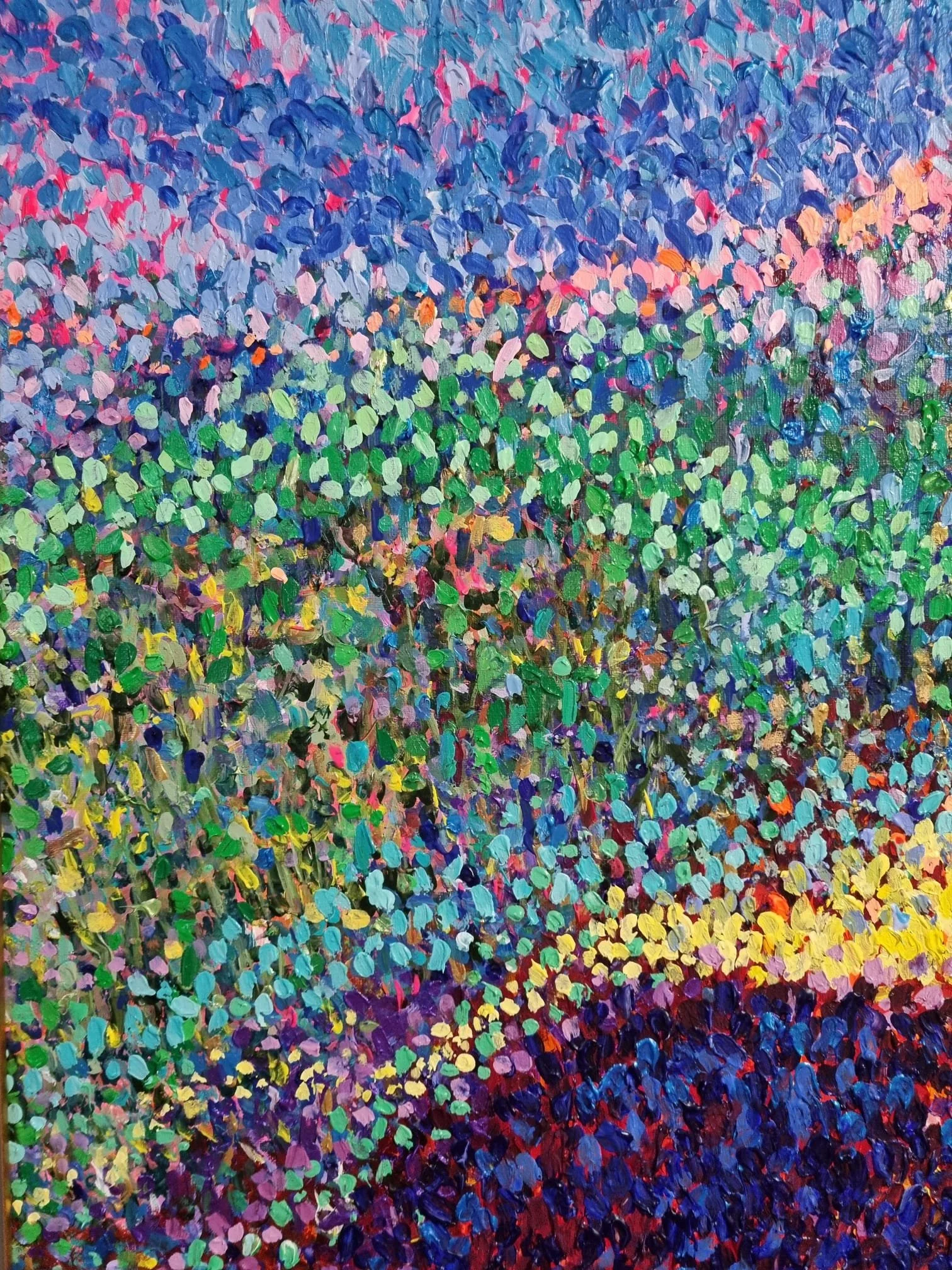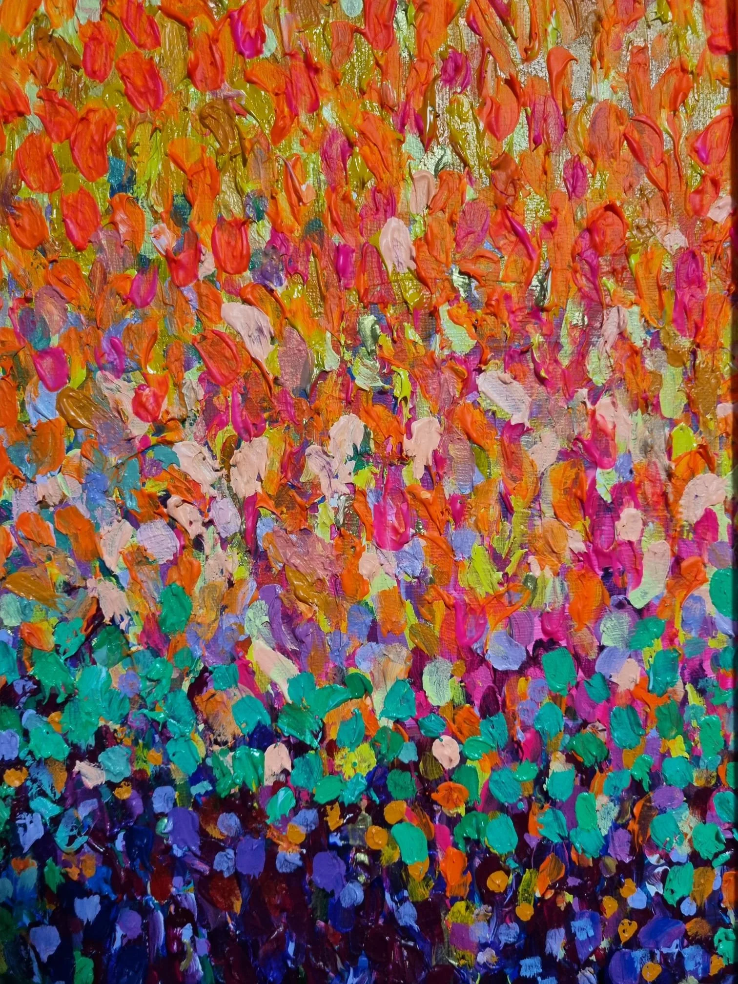 This second large canvas is a vibrant exploration of emotion and landscape that transforms colour into movement and feeling. Bold layers of textured acrylics flow across the canvas like shifting terrain - from fiery oranges and golds to tranquil blues and greens. The result is a scene that feels both real and imagined: a reflection of inner rhythm, balance, and renewal. This work celebrates the beauty of instinctive creation — the harmony that emerges when structure yields to spontaneity.